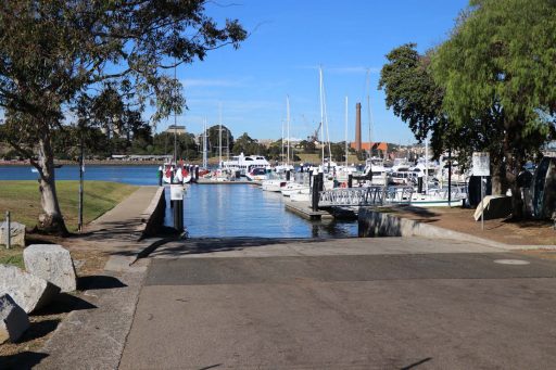 There is a pontoon on the ramp, multiple parking spaces and grass area for picnics.