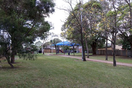 This local park includes a grass area, tree shade, covered playground and smaller enclosed area with play equipment for younger children.