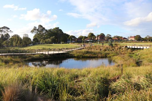 Covering over four hectares, this new parkland features wetland ponds with boardwalks, a shared path with exercise equipment, skatepark, half basketball court, large playground with a flying fox, and undercover picnic and barbecue amenities.