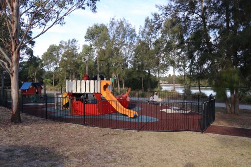 Located in the River Park, this enclosed playground features a boat-shaped climbing play gym with ladder, slide and cubby house, rockers, and see-saw.