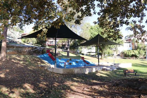 This partially covered, local playground has a bright blue coloured climbing slope with slides, swings, spinner and rocker and sandy surface. There are also barbecues with covered picnic tables and toilets.