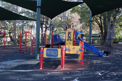 Protected by a childproof fence and large shade structure, this popular playground includes an assortment of brightly coloured play equipment, including a climbing gym with slides and activity stations, climbing web wall and softfall surface.