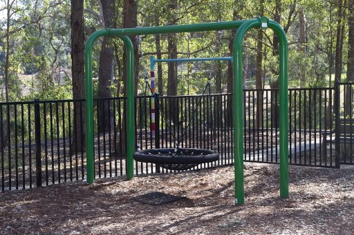 Surrounded by trees, this playground has swings, including a bird’s nest swing, slides and a rocker. There is also fitness equipment, basketball half-court, barbecue and picnic facilities, and walking paths around the reserve.