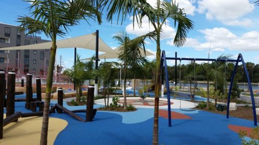 Located right on the Parramatta River foreshore, this wonderful playground has a number of nature-based play elements, including logs and sandstone blocks to climb on. There is also a bright blue climbing play gym, swings, slides, softfall surface and shade cloths.