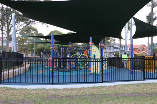 This shaded and enclosed playground has a large, colourful climbing play gym with acitivity stations, accessible swing and softfall surface. There are also playing fields, a cricket pitch and practice nets, exercise track and equipment, picnic shelters and barbecue facilities.