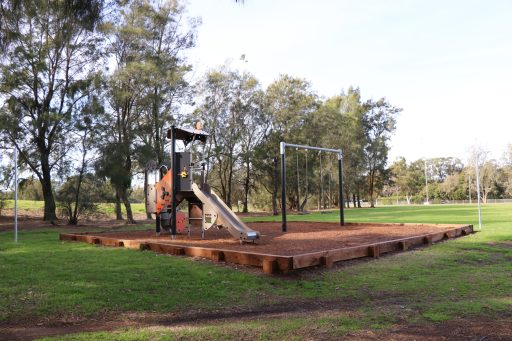Surrounded by several playing fields, this playground has a climbing play gym, slide and small rock climbing wall.