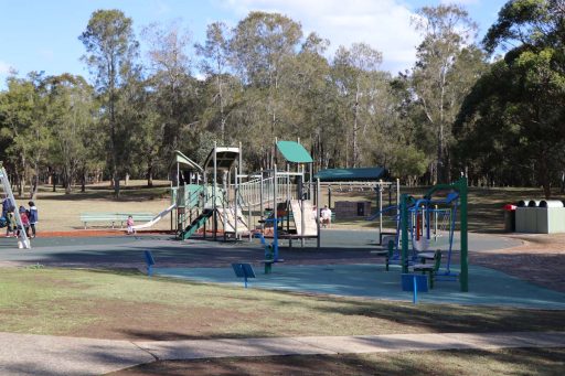 Located in the centre of this scenic park, the playground has a large climbing play gym, swings and softfall surface. There is also fitness equipment, picnic tables, barbecues, walking paths and toilets.