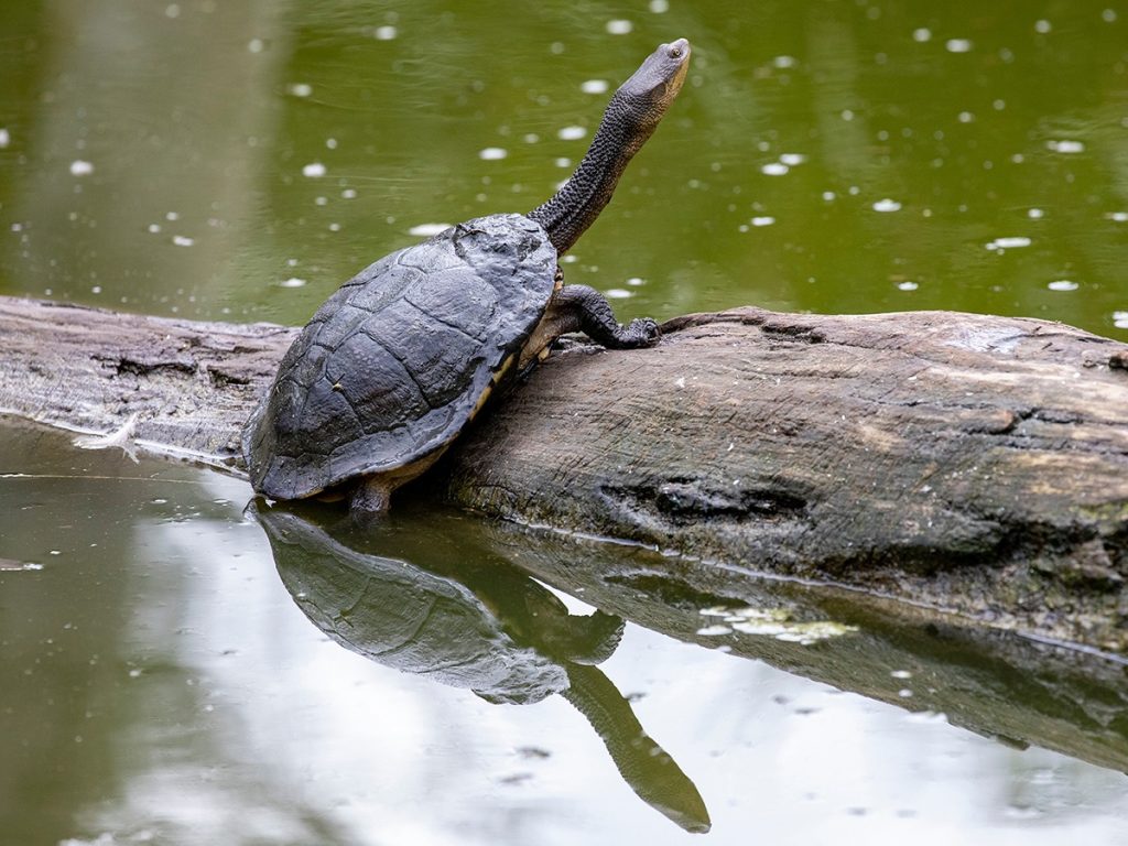 A carnivorous species, the turtle’s diet consists of fish, tadpoles, frogs, crayfish and insects ‒ using its webbed feet and jaws to tear apart large food items.