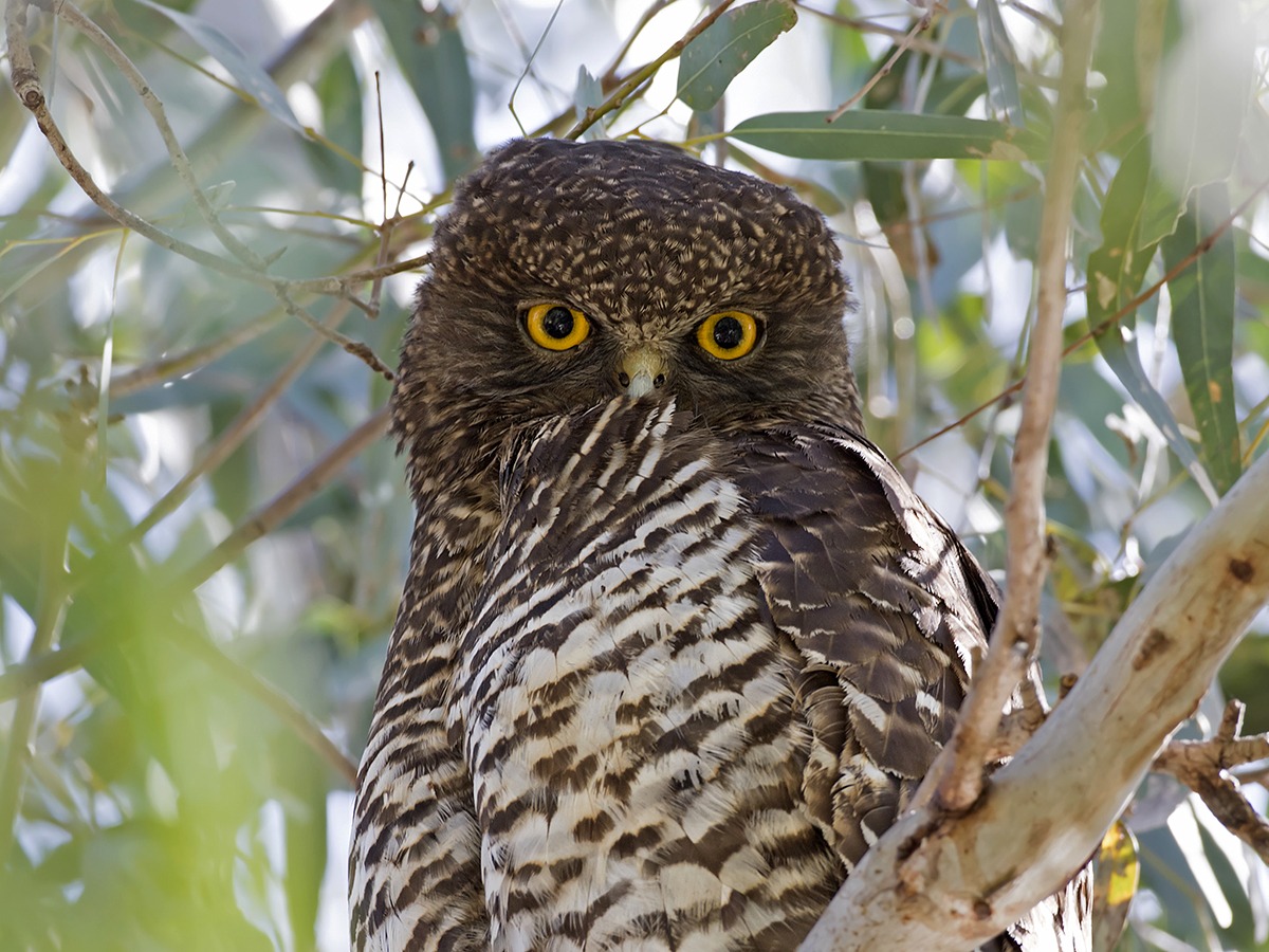 The Powerful Owl (Ninox strenua) is the largest owl in Australasia which is commonly found in eastern and south eastern parts of Australia. This species can grow up to 60cm in length with a wingspan of 140cm. It has a relatively small head and a rounded tail, and large yellow/orange feet that are equipped with sharp talons. The upper parts of the body are greyish-brown with indistinct off-white bars, and the underparts are whitish with dark greyish-brown V-shaped markings. It is known for its distinctive yellow eyes that are set in a dark grey/brown facial mask. The sexes are similar but the female is smaller with a narrower head.