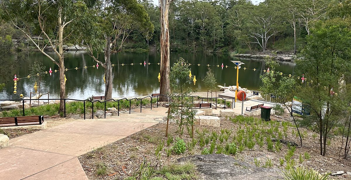 Lake Parramatta is located in North Parramatta. Surrounded by beautiful bushland, the site underwent upgrades in 2024 to provide better access and safety, including new stairs, a sloping beach entry, and a lifeguard platform. Other improvements include sandstone seating, tree planting, native gardens, and an outdoor shower.